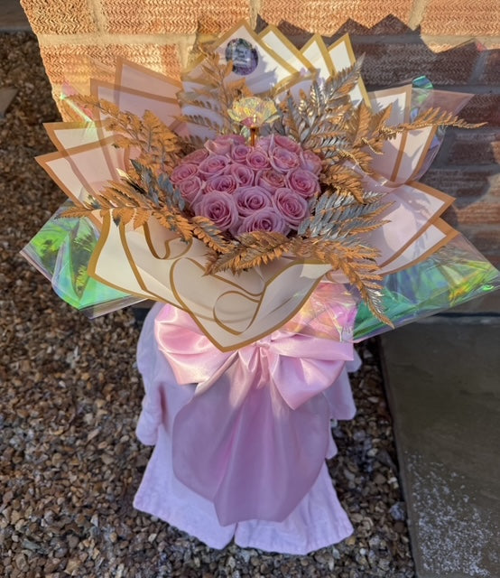 Elegant and striking, the Rose Empress bouquet is designed to make a statement. Featuring a luxurious cluster of premium pink roses at its heart, this arrangement is beautifully framed with shimmering gold foliage and layered designer wrapping for a regal, modern finish.